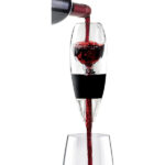 - Versez le vin dans l’entonnoir de l’aérateur, le vin traverse le système qui mélange l’air adéquatement ; la vitesse de versement crée cette oxygénation instantanée.