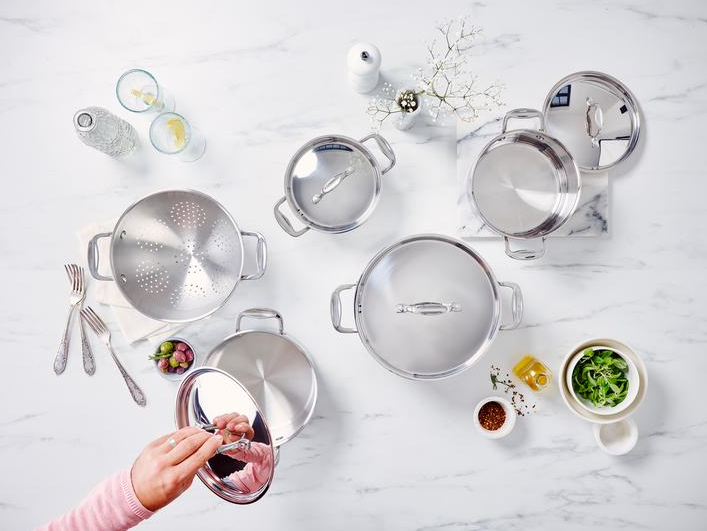 Sa base thermoradiant triple fond capsulé garantit une diffusion uniforme et rapide de la chaleur, éliminant les points froids et permettant une cuisson parfaite des soupes, ragoûts, légumes et plats mijotés. Les poignées ergonomiques rivetées en acier inoxydable offrent une prise en main sécurisée, même lorsque le faitout est plein.