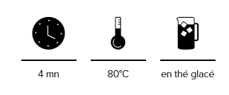 Faire infuser un sachet 3/4 minutes dans 1 litre d’eau à 90°C. Laissez refroidir et verser sur glace dans une carafe. À conserver au frais et à consommer dans les 48 heures après préparation.
