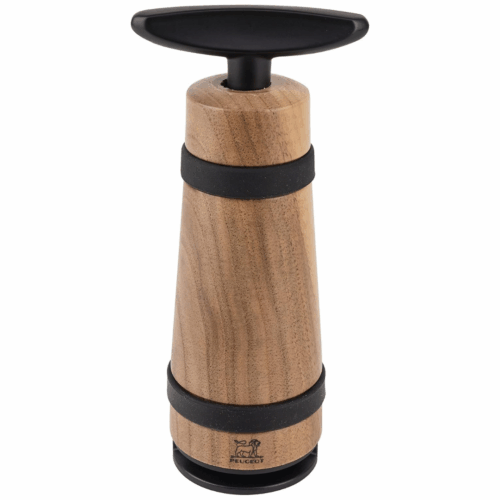 Matériaux nobles | Bois de noyer certifié PEFC, tourné avec soin dans la manufacture Peugeot Saveurs en Franche‑Comté. Anneaux noirs décoratifs rappelant les tonneaux de vin. |