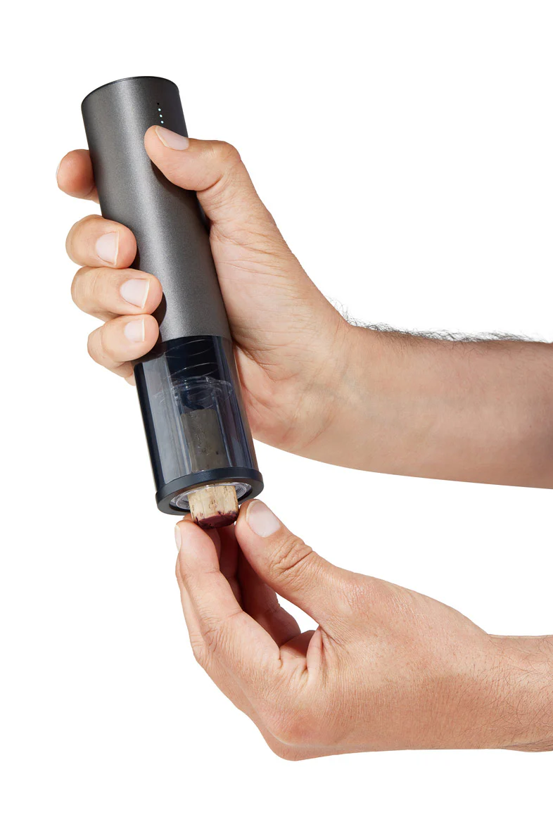 Le tire-bouchon est livré avec un câble USB-C pour une recharge rapide et un coupe-capsule en aluminium pour retirer facilement les scellés. Une charge complète permet de déboucher plusieurs bouteilles consécutives, et quatre indicateurs LED à l’avant indiquent le niveau de batterie et l’état de charge.