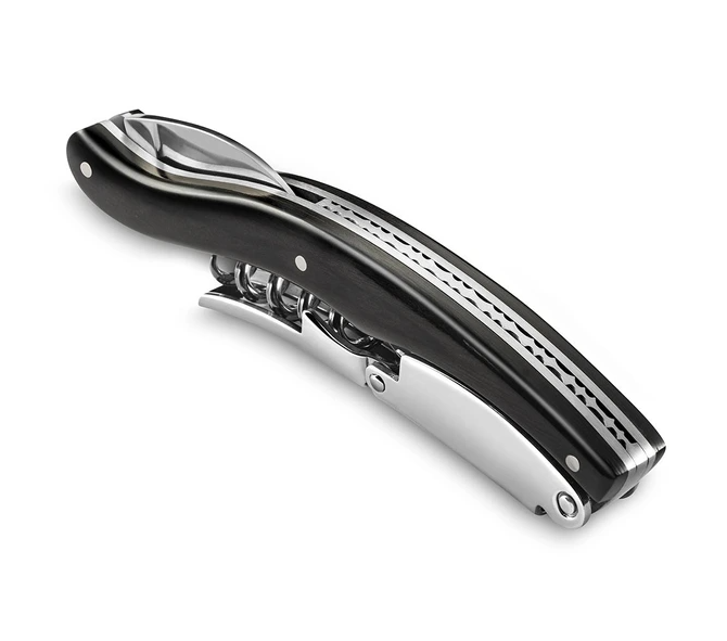 Sa mèche en acier inoxydable rainurée garantit une pénétration fluide dans le liège, tandis que le ressort guilloché renforce la stabilité lors de l’extraction. Le double-crapaud poli brillant offre un appui efficace pour retirer le bouchon avec aisance. Le manche est fabriqué en bois compressé noir, renforcé par des rivets en inox pour une tenue durable.